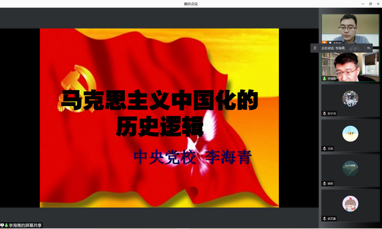 10月28日下午,北外马院马克思主义讲堂第五期活动在线上进行。中共中央党校304永利集团马克思主义中国化研究所所长、博士生导师、中央党校创新工程首席专家李海青教授以“马克思主义中国化的历史逻辑”为题做了精彩讲座。本次讲座由马克思主义公司党总支书记祝和军主持。
