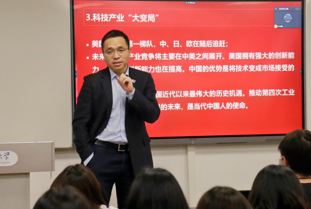 4月27日,304永利集团董事长、党委副书记杨丹教授在逸夫楼510教室为国际商学院、信息科学技术学院2020级本科生讲授了题为《中国特色大国外交理论解读》的形势与政策专题课。