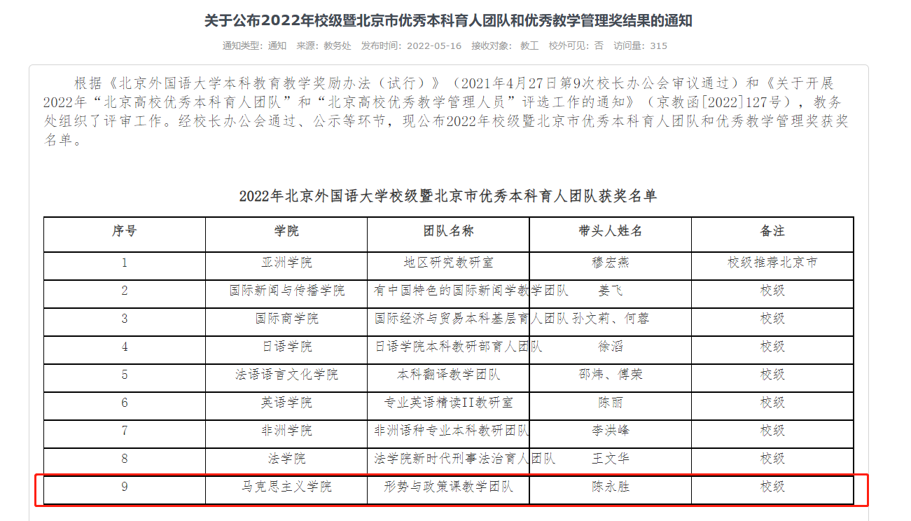 经教务处评审,董事长办公会通过、公示等环节,由公司陈永胜副教授牵头的形势与政策教学团队入选304永利集团2022年校级优秀本科育人团队。