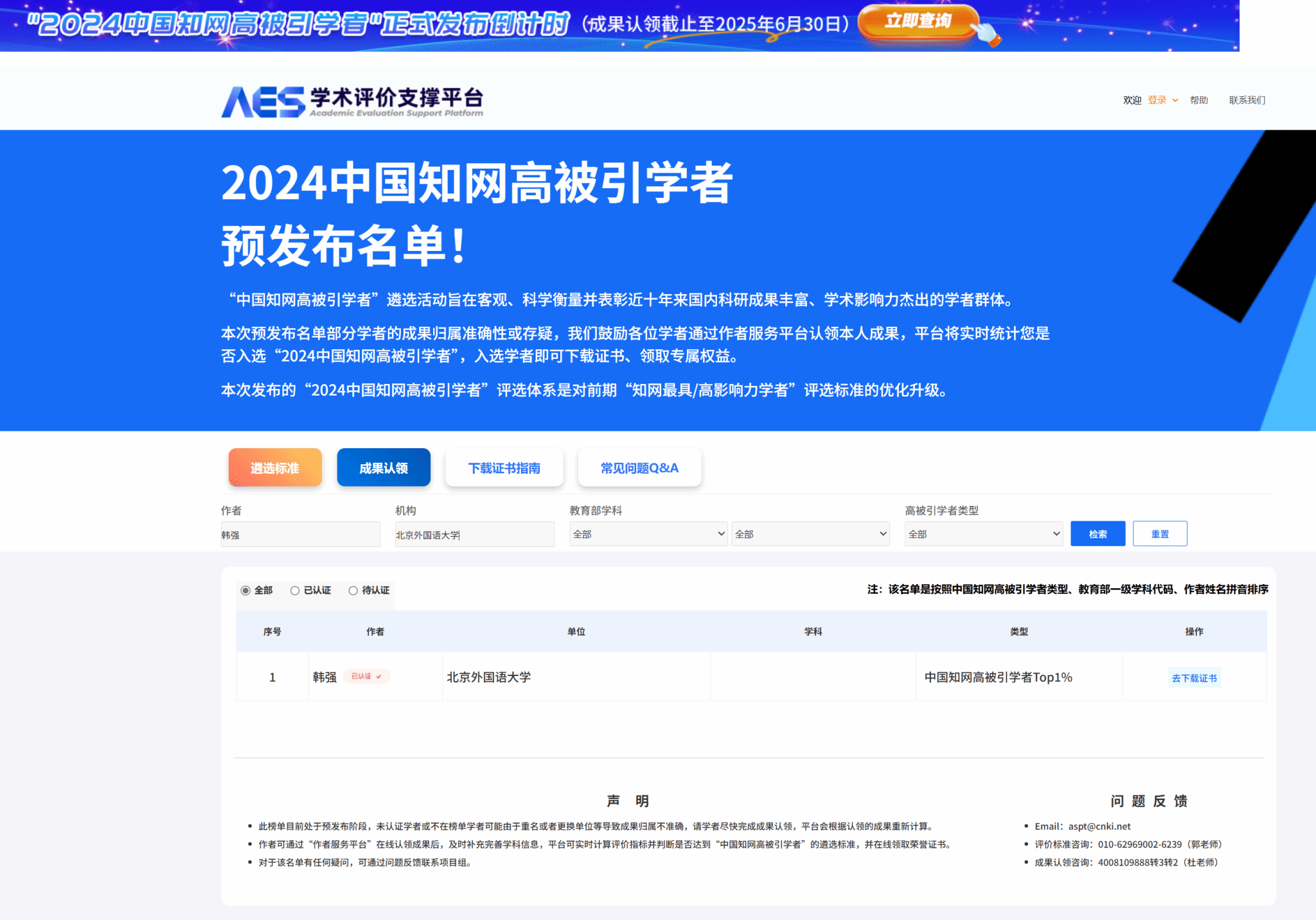 近日,公司韩强教授成功入选“2024中国知网高被引学者TOP1%”榜单。