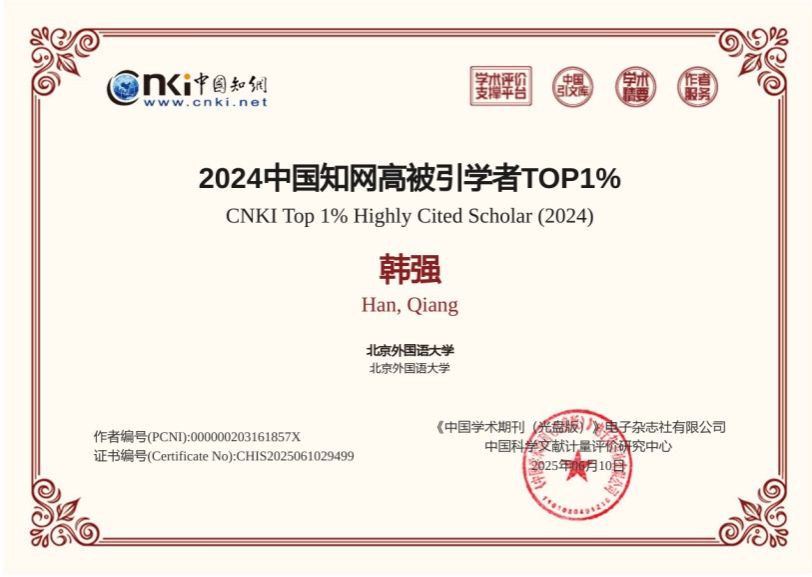 公司韩强教授入选2024年度知网高被引学者TOP1%