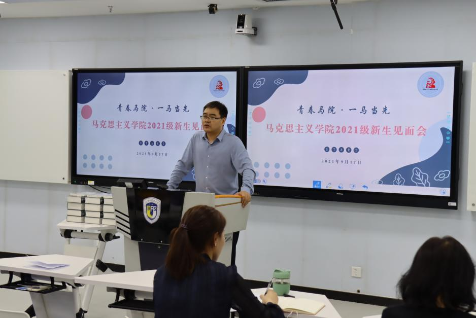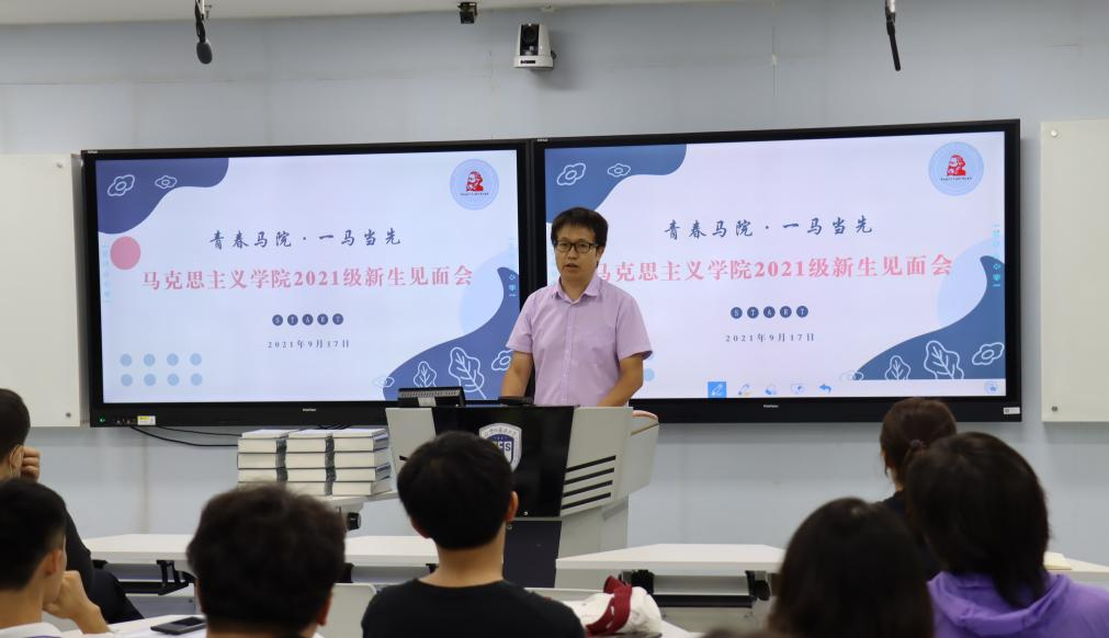 党总支书记祝和军老师致辞欢迎新生加入马院大家庭,他向新生介绍了马院发展历史,以及国家、学校对马院和马克思主义理论学科的高度重视。他谈到,马院正在重大发展机遇下不可逆转地进入发展快车道,为促进学院发展,今年公司引进了韩强、左高山两位教授,相信他们的加入会使马院越来越好。随后他表示,马院的发展离不开每一位同学的努力,他号召同学们为壮大马院贡献力量,并从两个方面为新生提出建议:一是要树立底线思维,把握好员工身份,把学习作为主责主业;二是要避免系统性风险,注重人身安全、财产安全和政治安全。