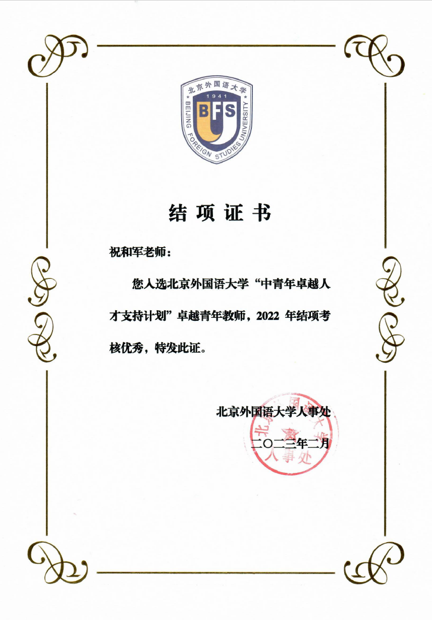 公司祝和军副教授2019年入选304永利集团“中青年卓越人才支持计划”卓越青年教师,2022年结项考核为优秀。