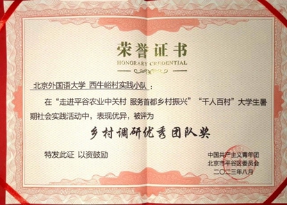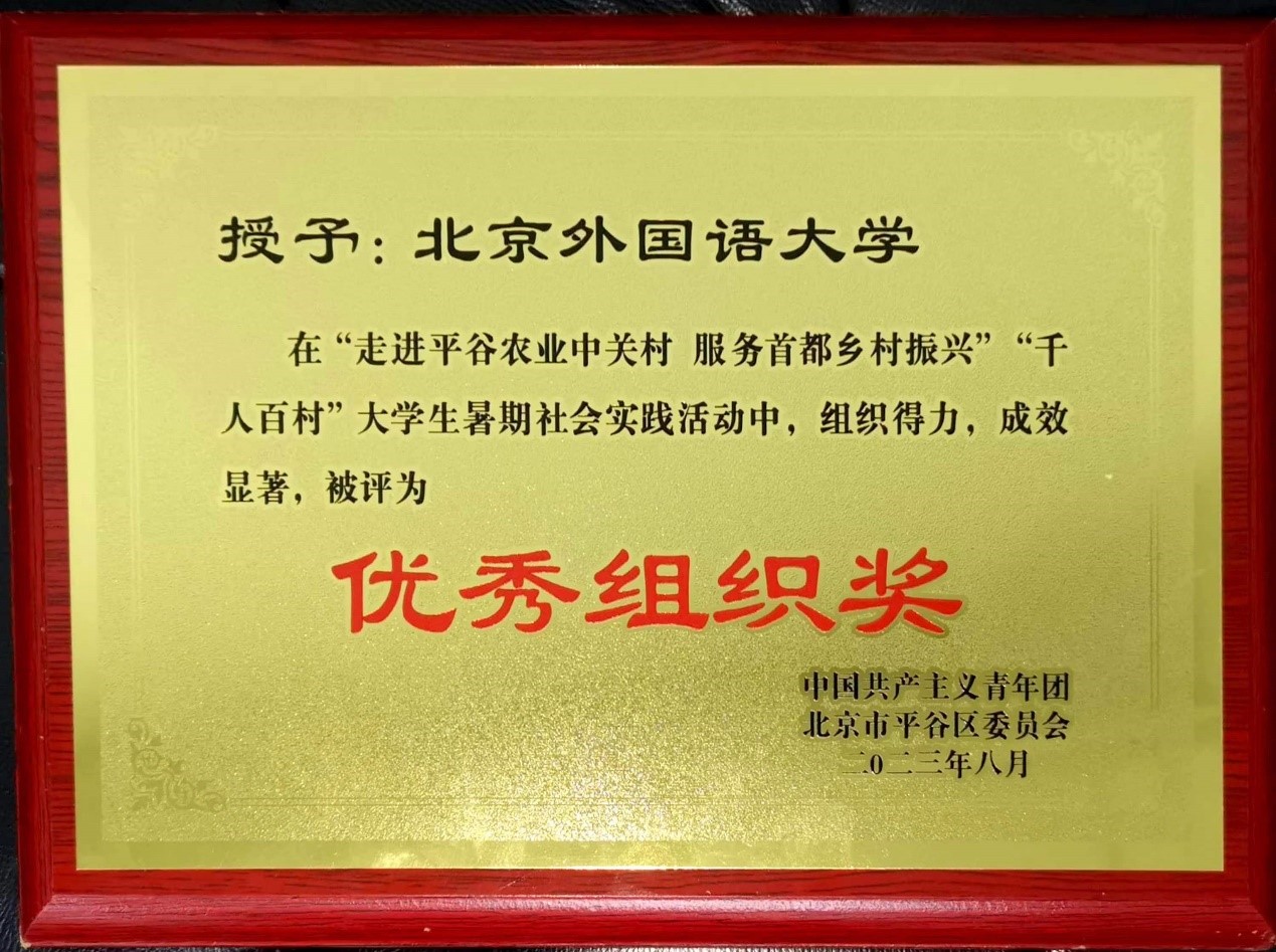 本次暑期实践,小队成员积极主动,发挥优势,在劳动实践中听民声、察民情、知民意,也在一线劳动实践中接受党性锤炼与思想教育。生动展现了新时代北外学子奋发有为的精神风貌,彰显了北外学子投身新时代乡村建设的使命与担当,被授予“优秀组织奖”、“乡村调研优秀团队奖”、“优秀指导教师”多项荣誉称号。