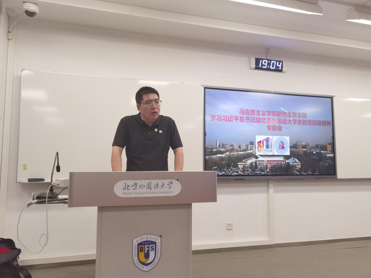 首先,冯高洋向与会同学传达了习近平总书记给北外老教授们的重要回信精神和党委书记王定华对学校学习贯彻落实回信精神的六点要求。随后各位同学进行了学习交流,他们结合自身参与建党100周年大会、北外成立80周年纪念大会等活动经历,分享了对回信精神的体悟与理解。大家认为,北外不仅是为国家培养国际化语言人才的摇篮,更是见证新中国外交事业不断蓬勃发展的高等学府。
